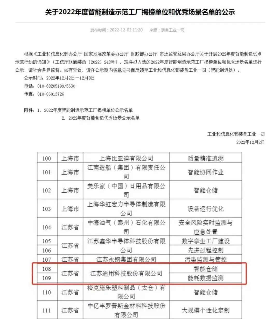 近日,江蘇通用科技股份有限公司獲評2022年度國家智能制造優秀場景予以公示。國家級智能制造優秀場景是自2021年開始,為落實國家智能制造十