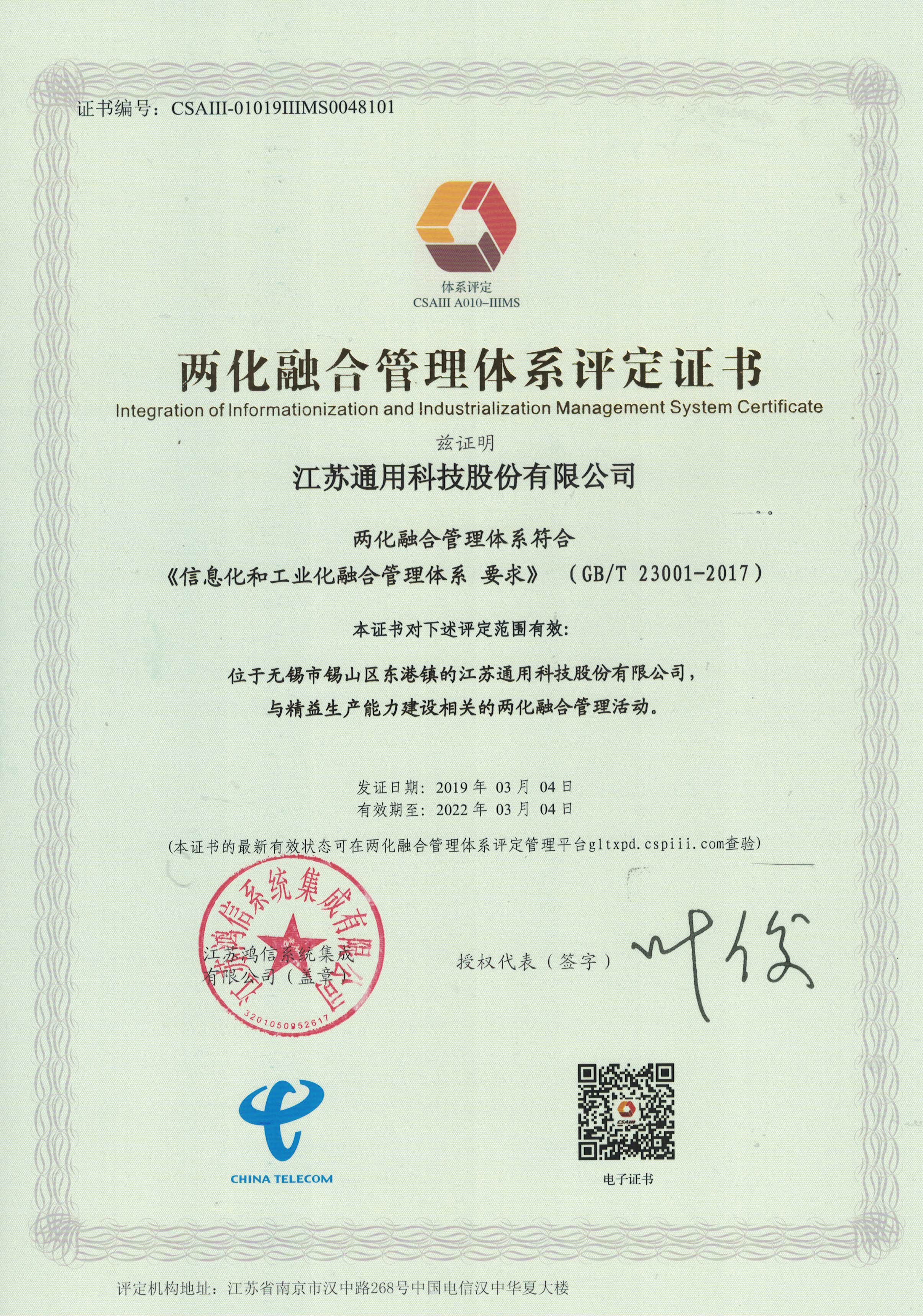 近日,通用股份順利通過國家兩化融合管理體系評(píng)定并獲得證書,評(píng)定范圍是與精益生產(chǎn)能力建設(shè)相關(guān)的兩化融合管理活動(dòng),標(biāo)志著公司在推
