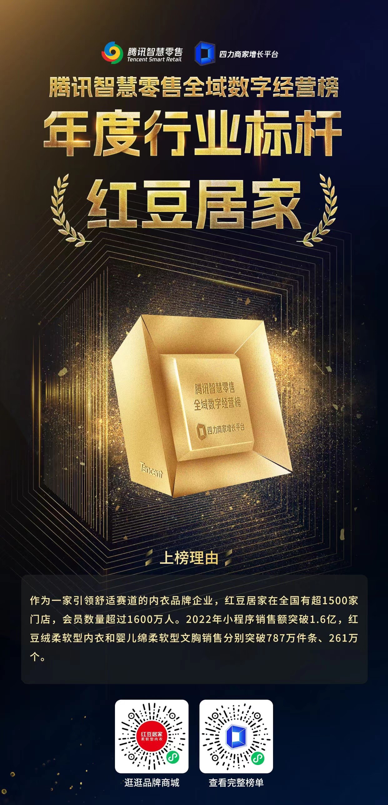 近日,由騰訊聯(lián)合《哈佛商業(yè)評論》中文版及多領域?qū)<遥笾腥A區(qū)艾菲等頭部機構(gòu)聯(lián)袂推薦,2022騰訊智慧零售全域數(shù)字經(jīng)營榜發(fā)布。紅豆居家憑