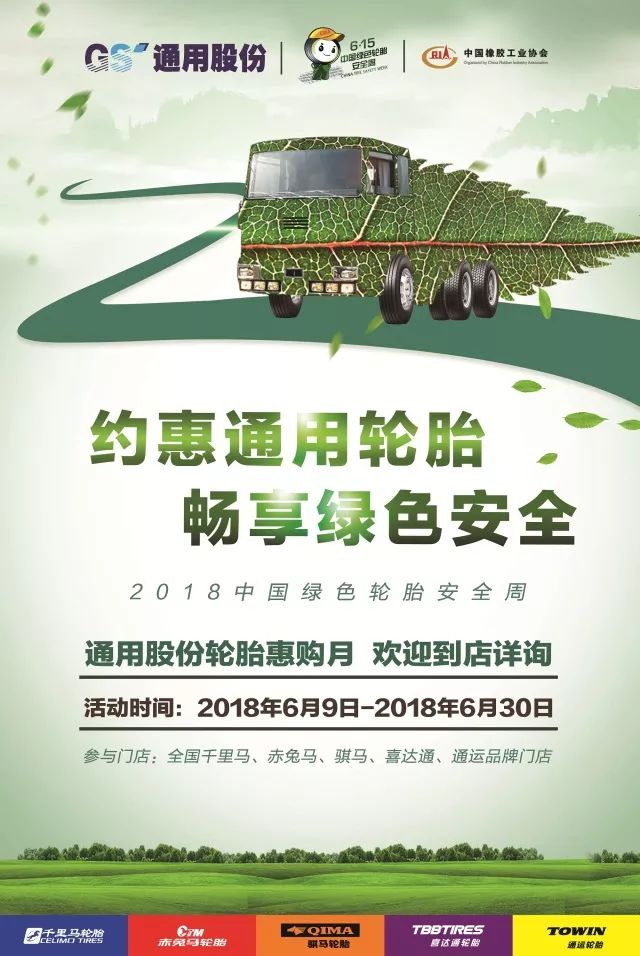 為了讓更多的普通消費者了解什么是綠色節(jié)能輪胎,輪胎標(biāo)簽的作用,以及輪胎安全使用知識,同時也為了答謝消費者長期以來的支持,通用股份在全國通用品牌門店(千里馬、赤兔馬、通運、騏馬、喜達通)開展“約惠通用輪胎 暢享綠色安全”的輪胎惠購活動(2018年6月9日至6月30日),并采取滿減優(yōu)惠、幸運抽獎、好禮相送等形式,以實實在在的優(yōu)惠,與消費者共同擁抱安全出行。